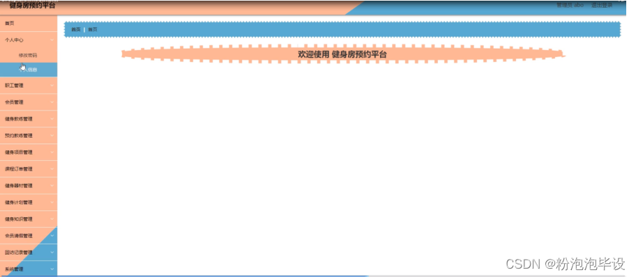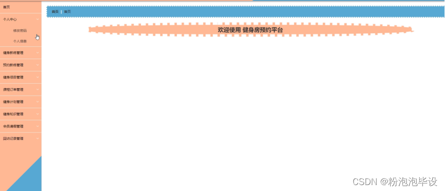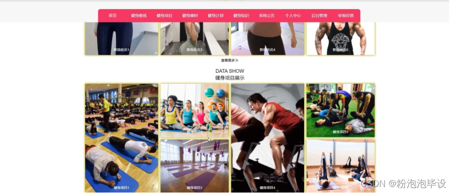 健身房预约平台,在平台首页可以查看首页、健身教练、健身项目、健身器材、健身计划、健身知识、系统公告、个人中心、后台管理、举报反馈等内容,并进行详细操作;如图5-1所示。