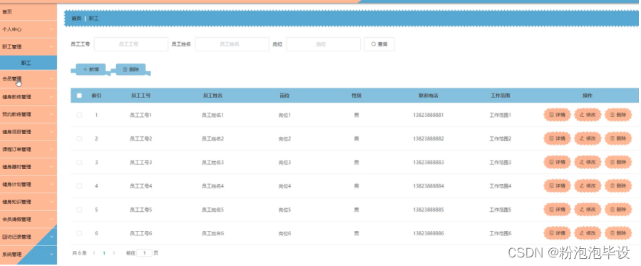 职工管理,在职工管理页面可以对索引、员工工号、员工姓名、岗位、性别、联系电话、工作范围等内容进行详情、修改或删除等操作,如图5-11所示。