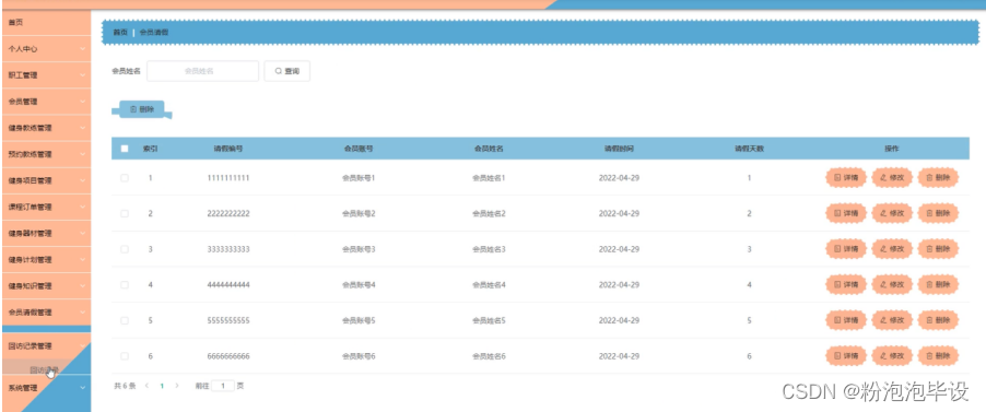 会员请假管理,在会员请假管理页面可以对索引、请假编号、会员账号、会员姓名、请假时间、请假天数等内容进行详情、修改或删除等操作;如图5-20所示。