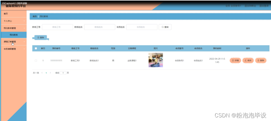 预约教练管理,在预约教练管理页面中可以对索引、预约编号、教练工号、教练姓名、性别、主教课程、照片、会员账号、会员姓名、预约时间等内容进行详情、修改或删除等操作,如图5-29所示。