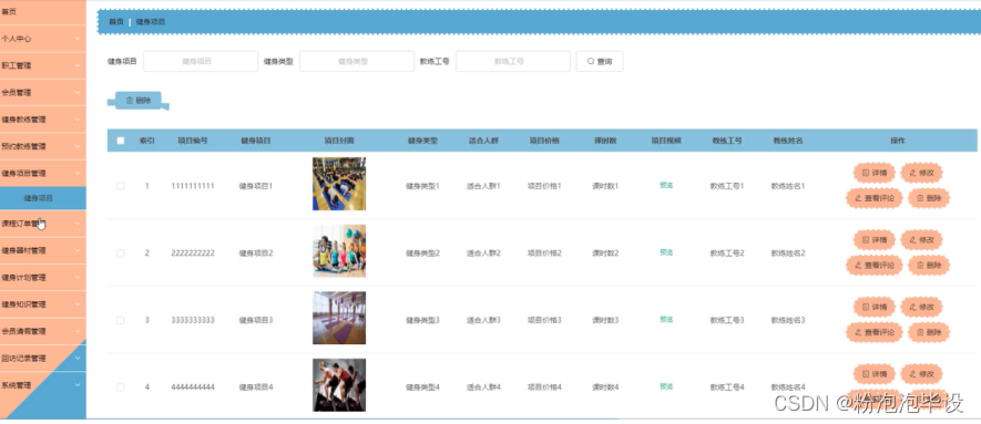 健身项目管理,在健身项目管理页面可以对索引、项目编号、健身项目、项目封面、健身类型、适合人群、项目价格、课时数、项目视频、教练工号、教练姓名等内容进行详情、修改、查看评论或删除等操作;如图5-15所示。