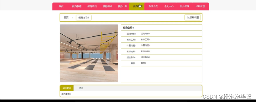 健身教练,在健身教练页面可以查看教练姓名、教练工号、主教课程、性别、年龄身高、体重等内容进行预约、评论或收藏等操作,如图5-3所示。