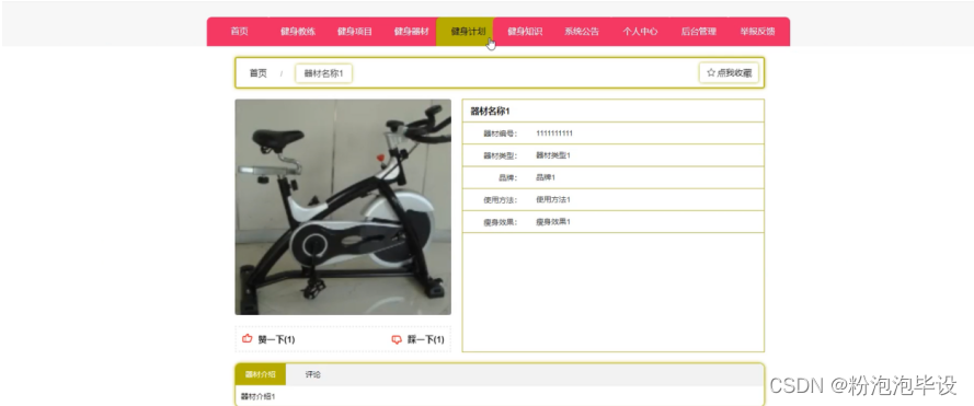 健身器材,在健身器材页面可以查看器材名称、器材编号、器材类型、品牌、使用方法、瘦身效果等内容进行评论或收藏等操作,如图5-5所示。