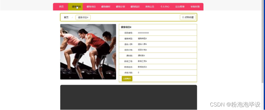 健身项目,在健身项目页面可以查看健身项目、项目编号、健身类型、适合人群、项目价格、课时数、教练工号、教练姓名、点击次数等内容进行购买、评论或收藏等操作,如图5-4所示。