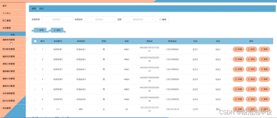 会员管理,在会员管理页面可以对索引、会员账号、会员姓名、性别、年龄、身份证、联系电话、生日、住址等内容进行详情、修改或删除等操作,如图5-12所示。