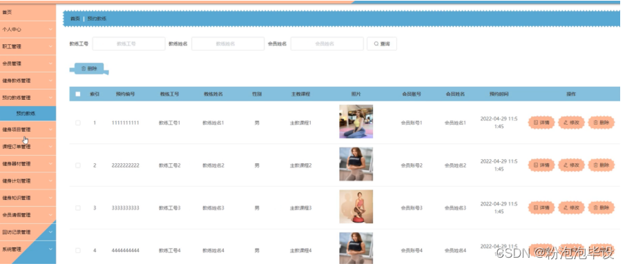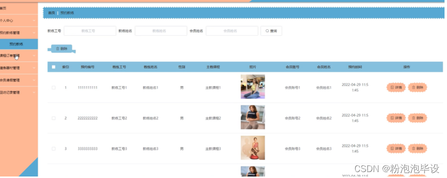 预约教练管理,在预约教练管理页面中可以对索引、预约编号、教练工号、教练姓名、性别、主教课程、照片、会员账号、会员姓名、预约时间等内容进行详情或删除等操作,如图5-24所示。
