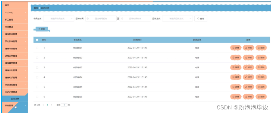 回访记录管理,在回访记录管理页面可以对索引、会员姓名、回访时间、回访方式等内容进行详情、修改或删除等操作;如图5-21所示。