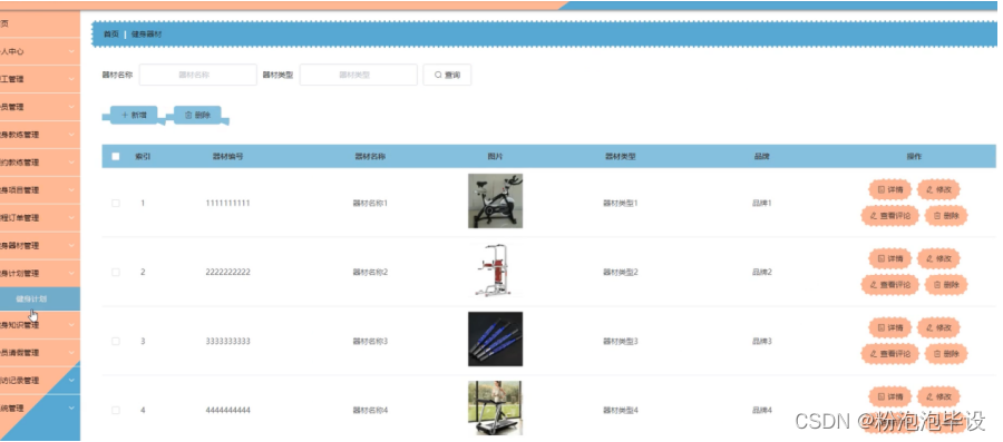 健身器材管理,在健身器材管理页面可以对索引、器材编号、器材名称、 图片、器材类型、品牌等内容进行详情、修改、查看评论或删除等操作;如图5-17所示。