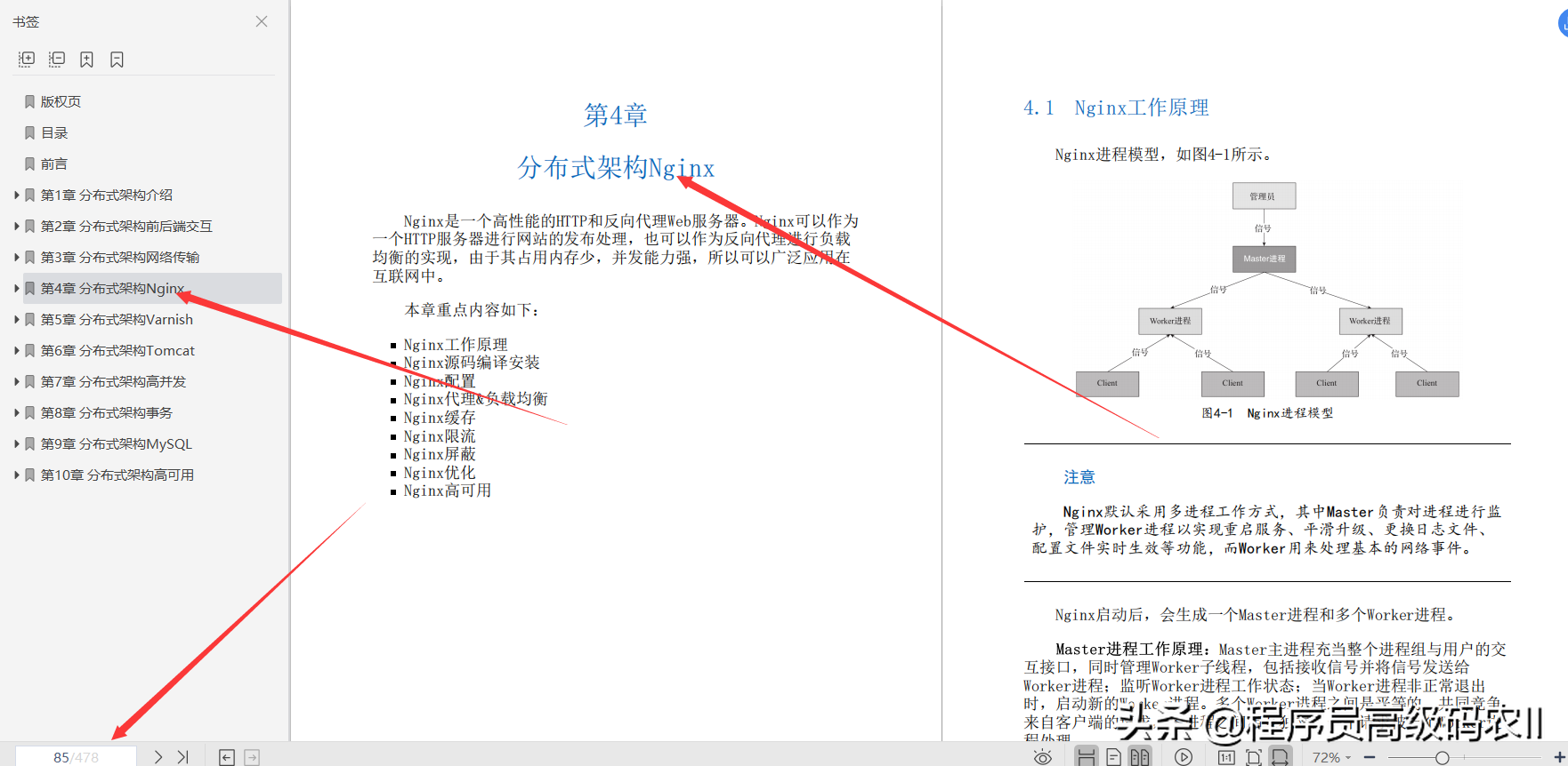 **第4章分布式架构Nginx;**Nginx是一个高性能的HTTP和反向代理Web服务器。Nginx可以作为一个HTTP服务器进行网站的发布处理,也可以作为反向代理进行负载均衡的实现,由于其占用内存少,并发能力强,所以可以广泛应用在互联网中。