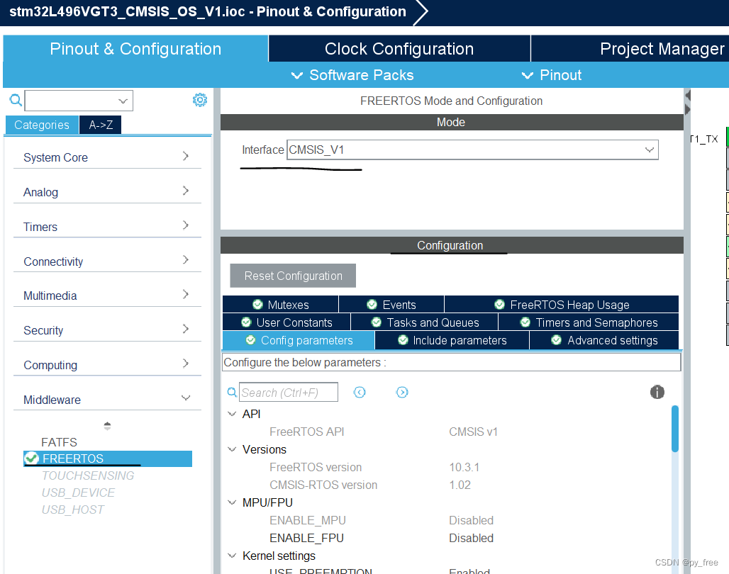 本文是基于STM32L496VGT3的MCU芯片创建一个新的STM32工程“stm32L496VGT3_CMSIS_OS_V1”,并使用FreeRTOS系统前,已经开启了lpusart串口通信及三个LED的GPIO_OUTPUT接口,及实现了串口lpusart及LED灯驱动(关于这边部分设置及实现就略过,读者可以参考本专栏的其他博文)。