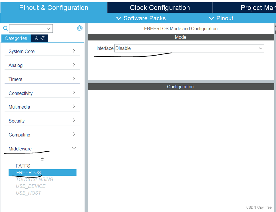 既然STM32CubeIDE已经把FreeRTOS深度整合到了自家的系统中,所以移植及使用FreeRTOS变得非常方便。STM32CubeMX图形配置界面的MiddleWare一栏,可以设置FreeRTOS是否开启来使用该实时系统。