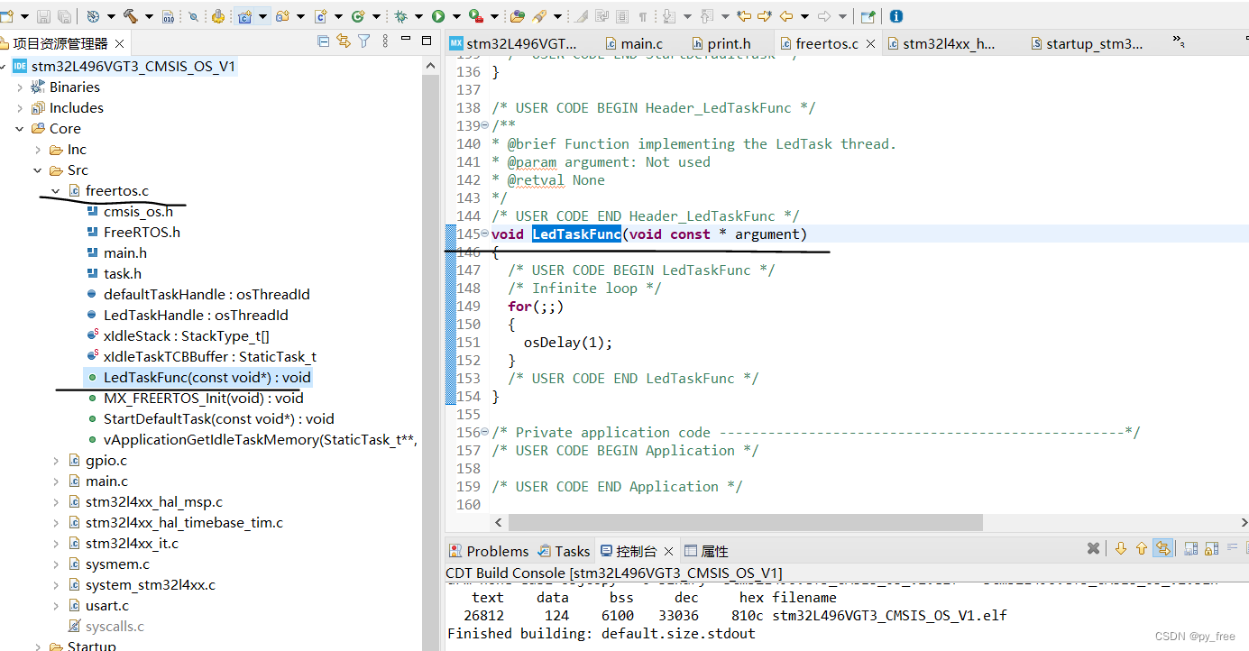 关于LEDTaskFunc函数调用,在主函数中初始化先调用FreeRTOS初始化API:“MX_FREERTOS_Init()”,然后在调用osKernelStart()启用。MX_FREERTOS_Init函数是图形配置生成的,在freertos.c文件中。另外为了防止主函数循环一直占用资源,调用一个延时HLA_Delay(100),防止LEDTaskFunc函数循环抢不到资源。