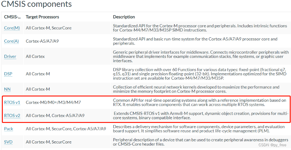 关于CMSIS_V1和CMSIS_V2的不同,详见CMSIS ARM官方关于微控制器软件接口标准CMSIS定义(如下图)。Cortex微控制器软件接口标准(CMSIS)是独立于供应商的硬件抽象层,用于基于Arm Cortex处理器的微控制器,并且CMSIS提供了到处理器和外围设备,实时操作系统以及中间件组件的接口。不同之处简单来说,v1使得软件能够在不同的实时操作系统下运行(屏蔽不同RTOS提供的API的差别),而v2则是拓展了RTOS v1,兼容更多的CPU架构和实时操作系统,说白话就是,CMSIS_V2是在CMSIS_V1上,兼容CMSIS_V1的,具有更多功能及支持更多硬件型号。