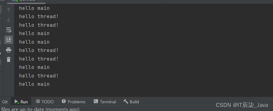 public class demo2 {public static void main(String[] args) {Thread t = new MyThread2();t.start();while (true){System.out.println("hello main");try {Thread.sleep(1000);} catch (InterruptedException e) {e.printStackTrace();}}}