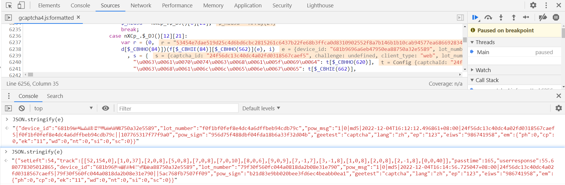 进去格式化文件后,在 6256 行打下断点,跟四代滑块一样,w 参数的值定义在第 6249 行,有 r 参数生成,r 定义在第 6237 行,加密方式也跟四代滑块一样,RSA + AES 加密,不同的在于 e 字典中的内容,下面那个是滑块的,无感没有 setLeft、track、passtime 和 userresponse,其他的加密算法可以看 【JavaScript 逆向】极验四代滑块验证码逆向分析: