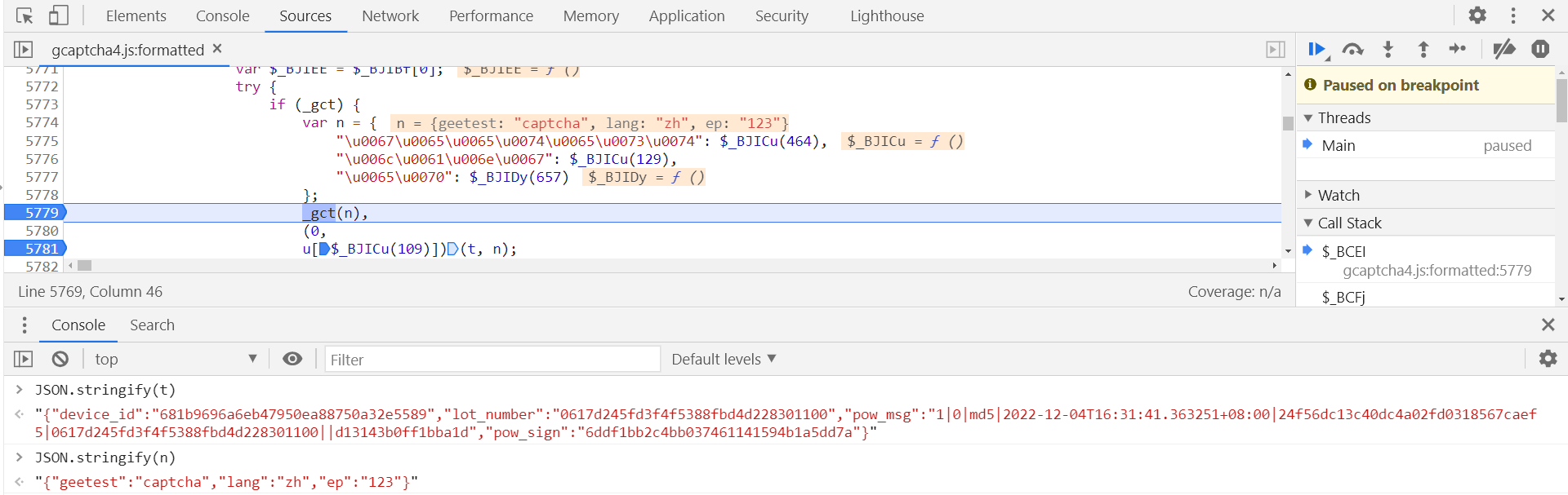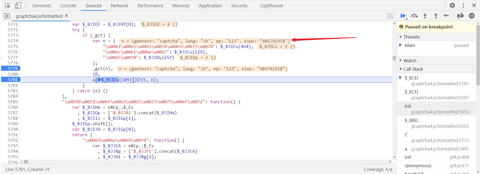 再在 5781 行打下断点,断住后会发现那个每天变的值生成了,证明是 _gct(n) 函数返回的: