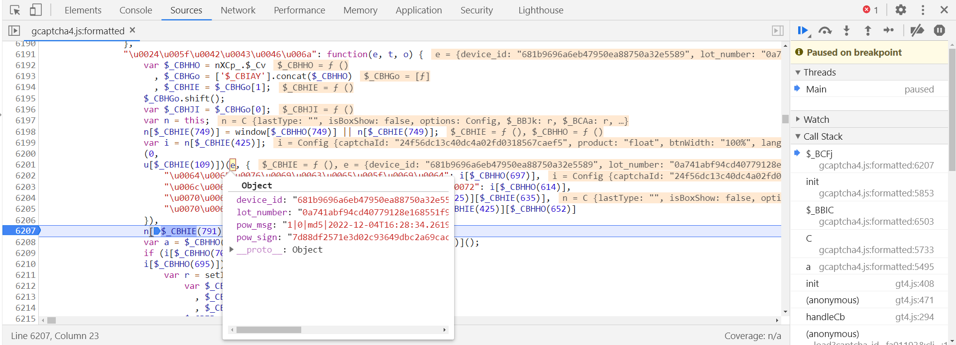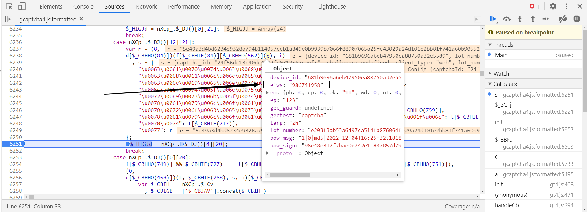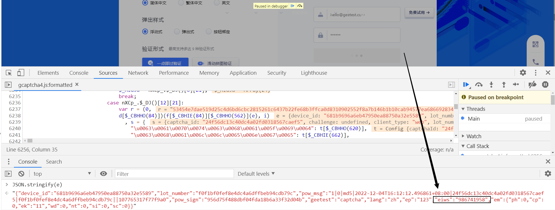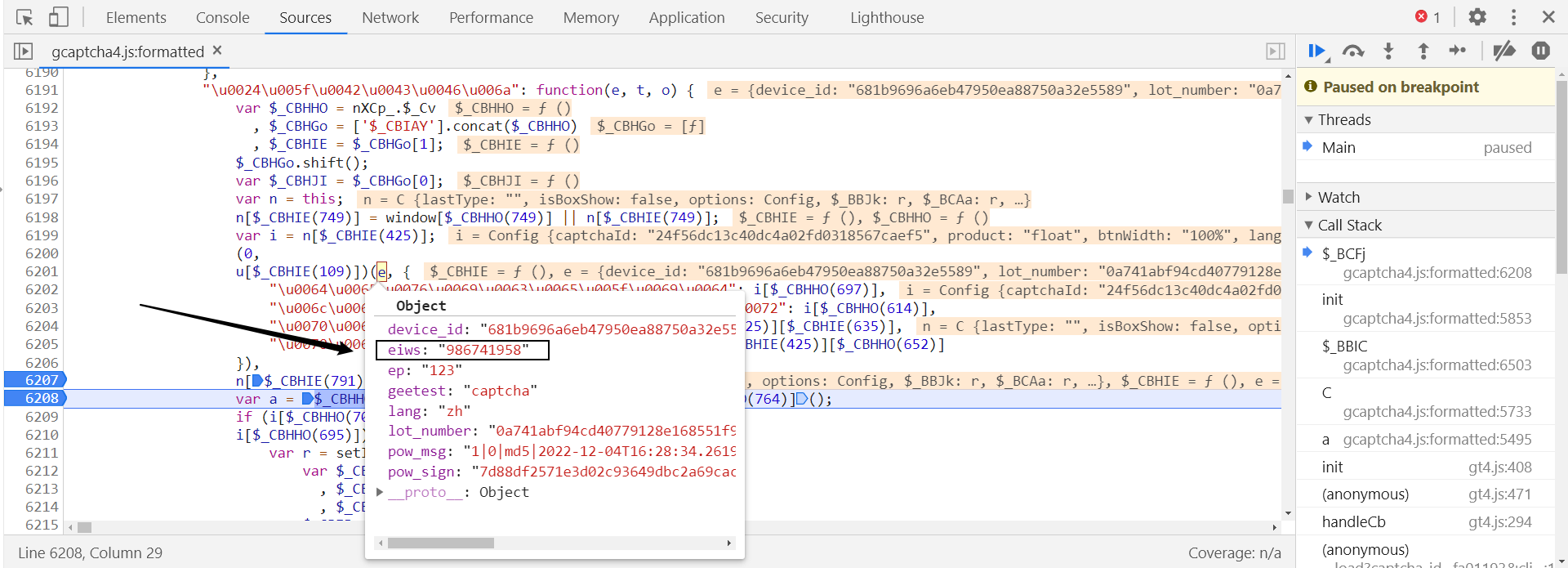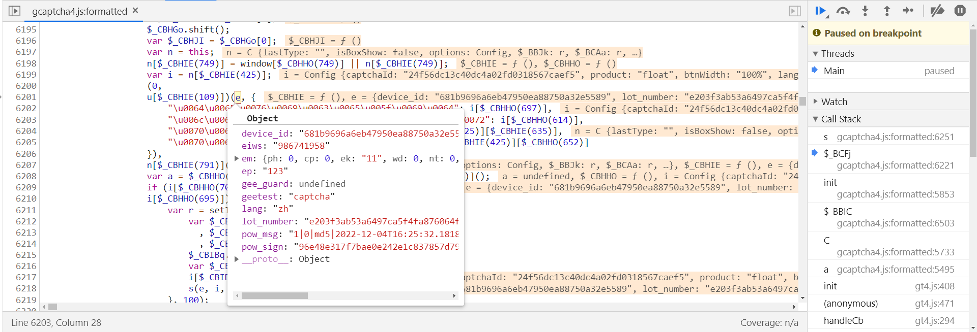 在第 6208 行打下断点,断住后,此时 e 字典中的其他参数值都生成了,证明是执行了 n[$_CBHIE(791)](e); 后生成的: