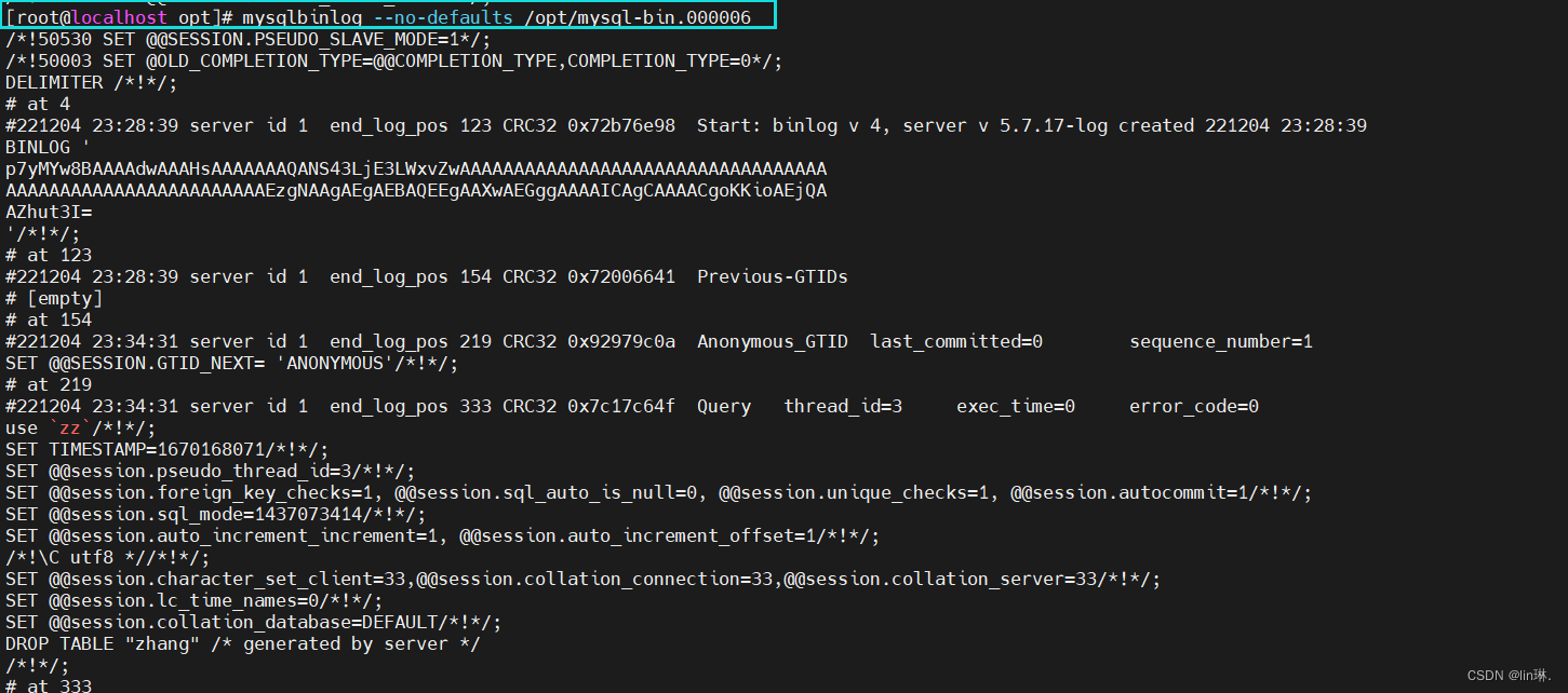 cp /usr/local/mysql/data/mysql-bin.000002 /opt/① mysqlbinlog --no-defaults /opt/mysql-bin.000002mysqlbinlog --no-defaults --base64-output=decode-rows -v /opt/mysql-bin.000002#--base64-output=decode-rows:使用64位编码机制去解码(decode)并按行读取(rows)