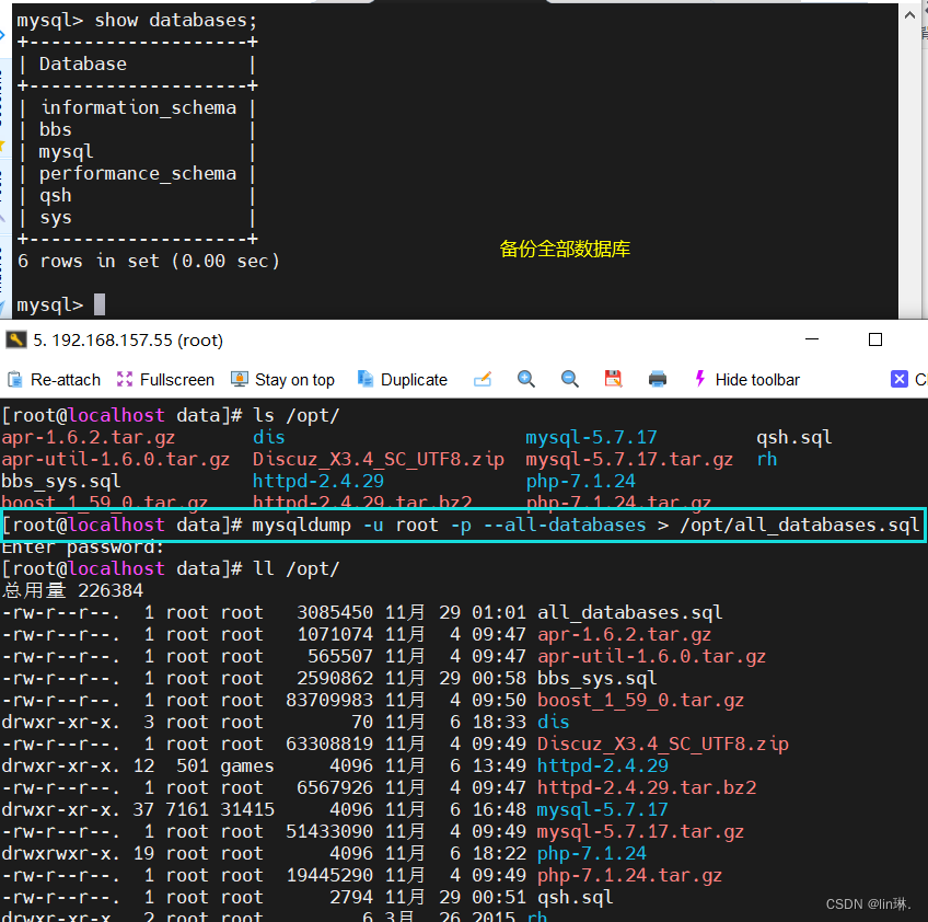 mysqldump -u root -p --databases mysql kgc > /opt/mysql-kgc.sql #备份mysql与 kgc两个库 (2)、完全备份 MySQL 服务器中所有的库