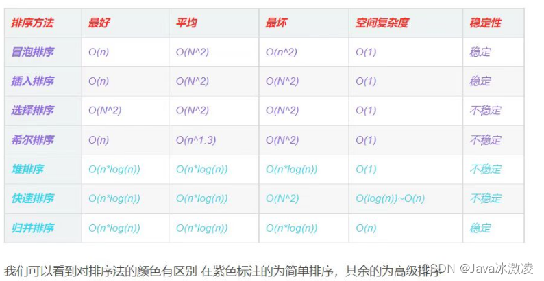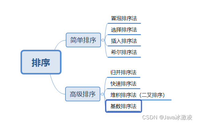 我们又可以串联起来之前的内容,这幅图中少了一项基数排序法,基数排序法属于高级排序,是一个稳定算法,时间复杂度最坏为O(N+R),空间复杂度为O(R)