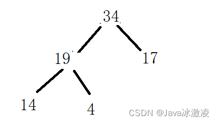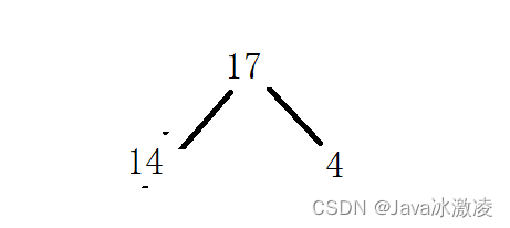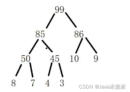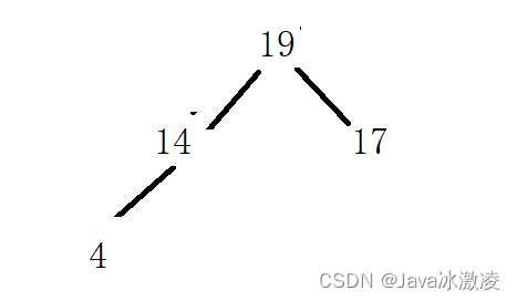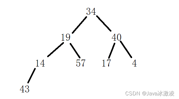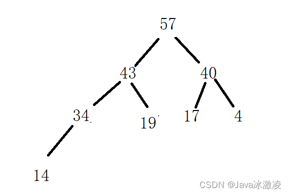 将57从树根返回并删除,重现建立堆积树,这边我们要提到一点,如果要删除树根的话,我们的操作是要先将完全二叉树的最后一个节点与树根的值做交换,我们再返回并删除最后一个节点,再将树根的值看做新加入的元素换到左右子树中较小的一端,依次比较直到找到合适的位置或到叶子