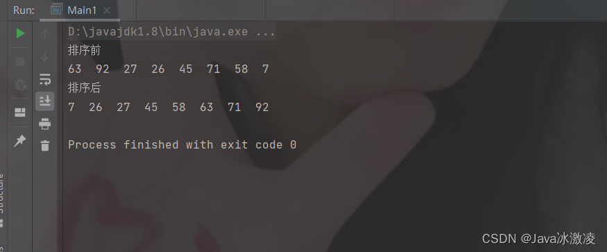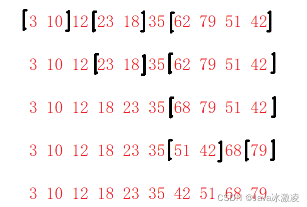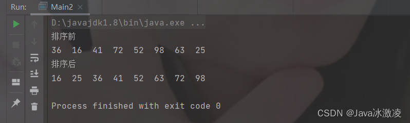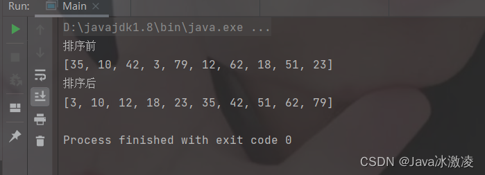 }public class Main {public static void main(String[] args) {Solution solution=new Solution();int[] elem=new int[]{35,10,42,3,79,12,62,18,51,23};System.out.println("排序前");System.out.println(Arrays.toString(elem));solution.sortArray(elem);System.out.println("排序后");System.out.println(Arrays.toString(elem));}