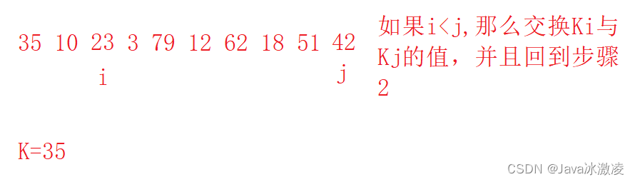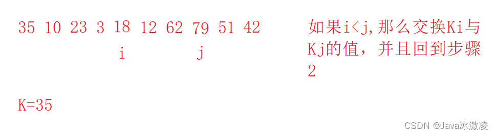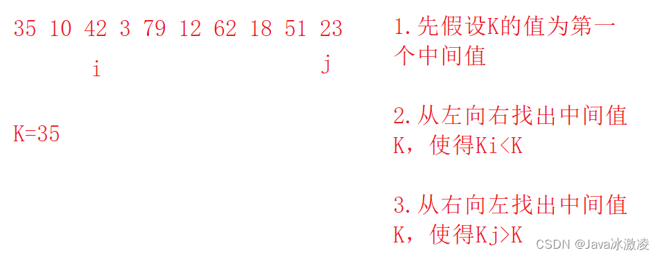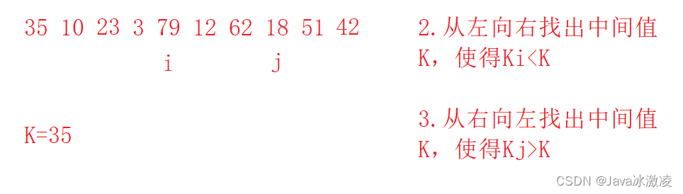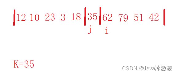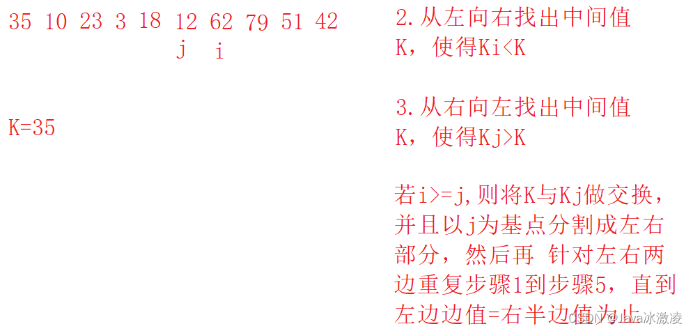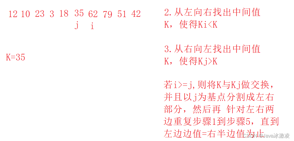 5.若i>=j,则将K与Kj做交换,并且以j为基点分割成左右部分,然后再 针对左右两边重复步骤1到步骤5,直到左边边值=右半边值为止