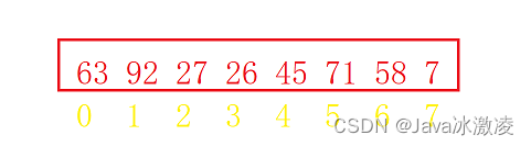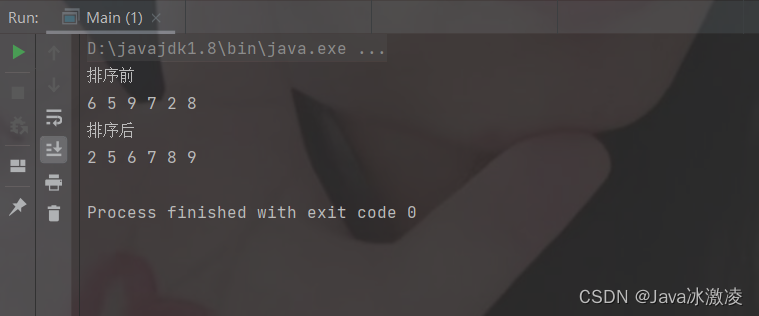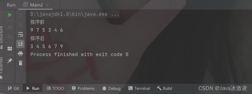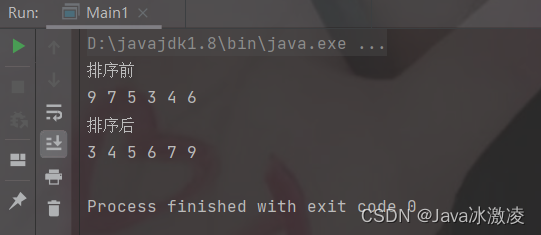 public class Main1 {public static void main(String[] args) {int[] arr=new int[]{9,7,5,3,4,6};System.out.println("排序前");for (int i = 0; i < arr.length; i++) {System.out.print(arr[i]+" ");}System.out.println();for (int i = 0; i