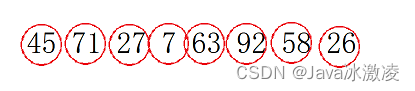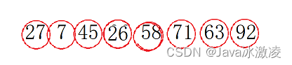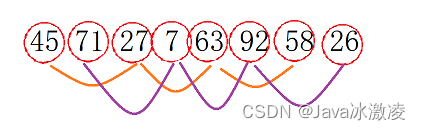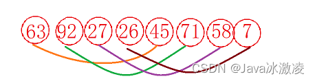 (2)区分完成后我们可以得到分为了四个区块 他们内容分别为:(63、45)(92、71)(27、58)(26、7) 再分别使用插入排序法排序成 (45、63)(71、92)(27、58)(7、26),在队列中的数据排序为下图