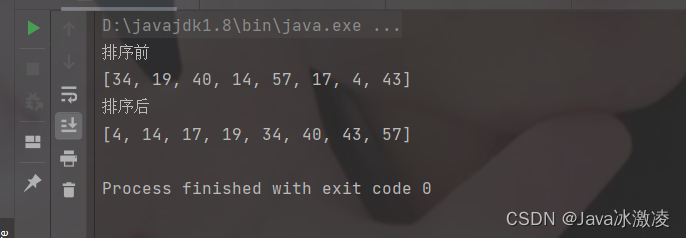 public class Main2 {public static void main(String[] args) {Solution solution=new Solution();int[] elem=new int[]{34,19,40,14,57,17,4,43};System.out.println("排序前");System.out.println(Arrays.toString(elem));solution.sortArray(elem);System.out.println("排序后");System.out.println(Arrays.toString(elem));}