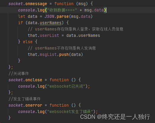 这个是最重要的事件,对于消息的处理方法都是在这里进行处理,几乎对于webSocket的业务逻辑代码都是写在这里。