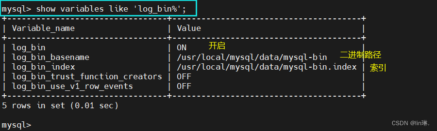 show variables like 'log_bin%'; #查看二进制日志是否开启