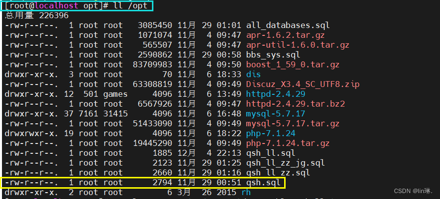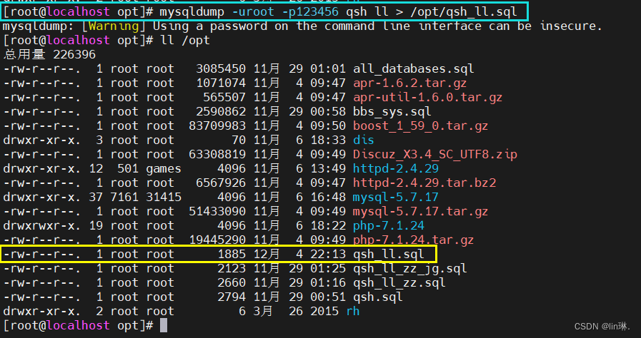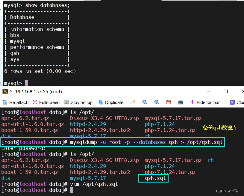 mysqldump -uroot -p123456 --databases qsh > /opt/qsh.sql 备份库后