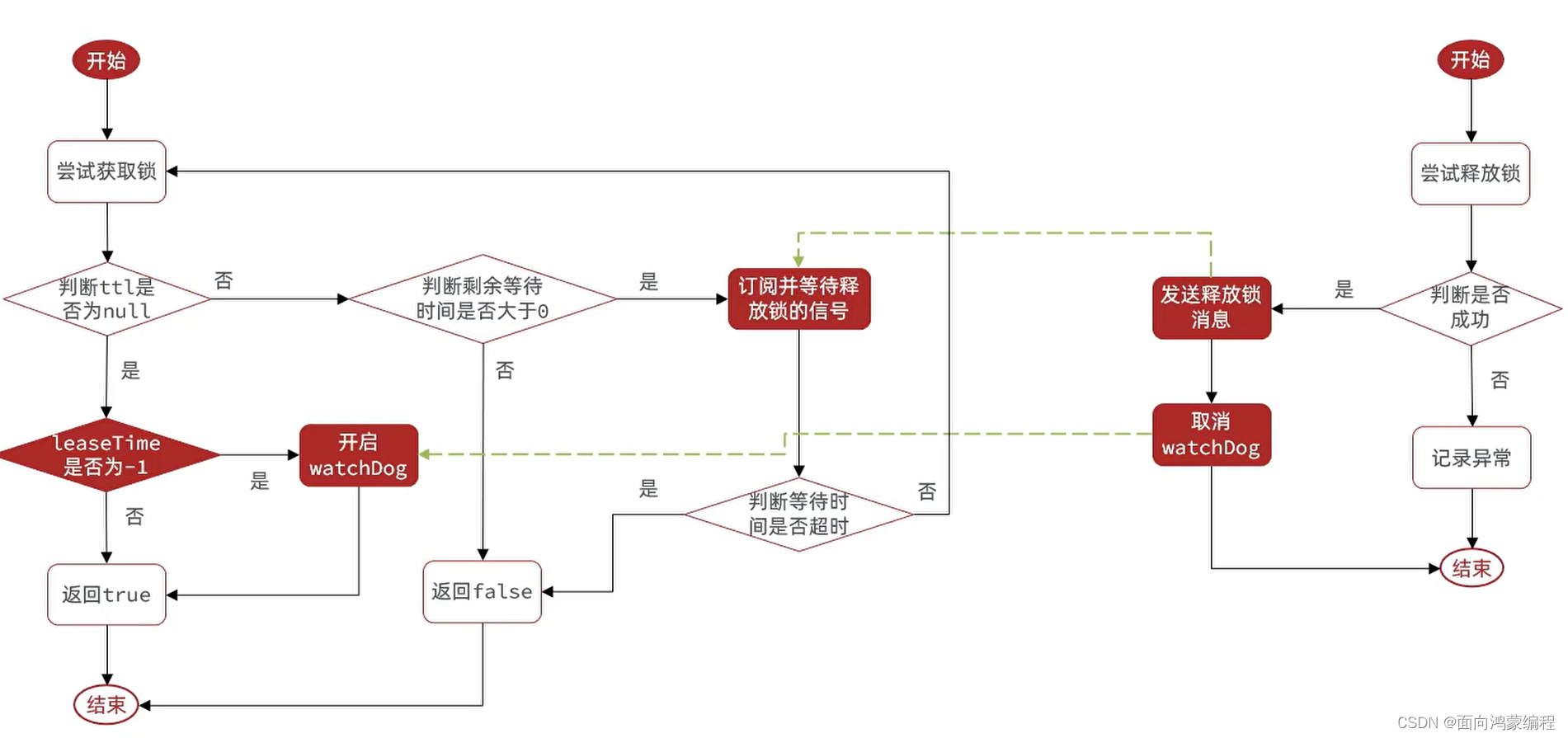 public boolean tryLock(long waitTime, long leaseTime, TimeUnit unit) throws InterruptedException {long newLeaseTime = -1;if (leaseTime != -1) {// waitTime 为 -1,表示不重试if (waitTime == -1) {newLeaseTime = unit.toMillis(leaseTime);} else {// 如果重试就会对时间做个扩容(放弃waitTime,使用newLeaseTime!)newLeaseTime = unit.toMillis(waitTime)*2; }}long time = System.currentTimeMillis();// 剩余时间long remainTime = -1;if (waitTime != -1) {remainTime = unit.toMillis(waitTime);}// 锁等待时间 与 剩余时间是一样的!long lockWaitTime = calcLockWaitTime(remainTime);int failedLocksLimit = failedLocksLimit();// 定义一个获取锁成功的集合,初始化肯定是0List acquiredLocks = new ArrayList<>(locks.size());for (ListIterator iterator = locks.listIterator(); iterator.hasNext();) {RLock lock = iterator.next();boolean lockAcquired;try {if (waitTime == -1 && leaseTime == -1) {lockAcquired = lock.tryLock();} else {long awaitTime = Math.min(lockWaitTime, remainTime);lockAcquired = lock.tryLock(awaitTime, newLeaseTime, TimeUnit.MILLISECONDS);}} catch (RedisResponseTimeoutException e) {unlockInner(Arrays.asList(lock));lockAcquired = false;} catch (Exception e) {lockAcquired = false;}if (lockAcquired) {acquiredLocks.add(lock);} else {if (locks.size() - acquiredLocks.size() == failedLocksLimit()) {break;}if (failedLocksLimit == 0) {unlockInner(acquiredLocks);if (waitTime == -1) {return false;}failedLocksLimit = failedLocksLimit();acquiredLocks.clear();// reset iteratorwhile (iterator.hasPrevious()) {iterator.previous();}} else {failedLocksLimit--;}}if (remainTime != -1) {remainTime -= System.currentTimeMillis() - time;time = System.currentTimeMillis();if (remainTime <= 0) {unlockInner(acquiredLocks);return false;}}}