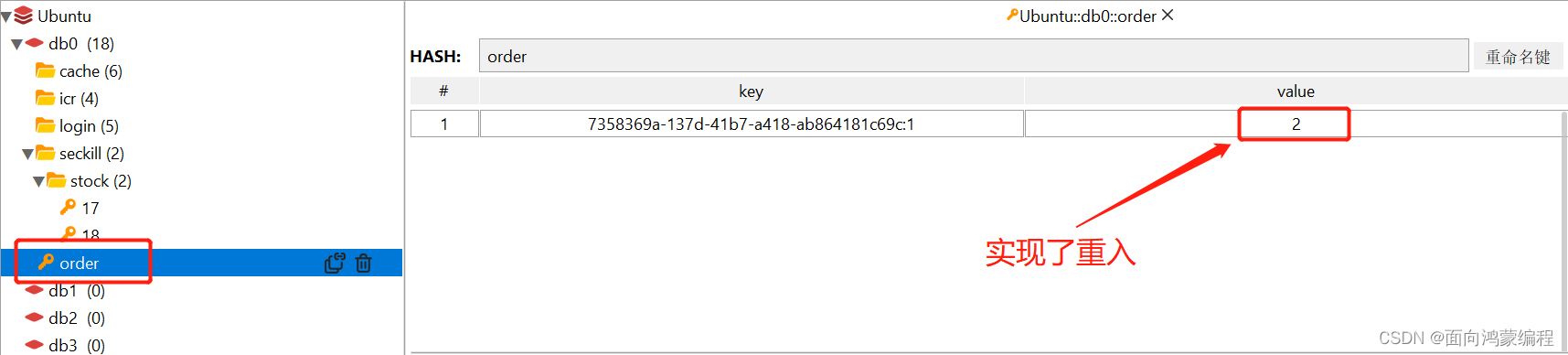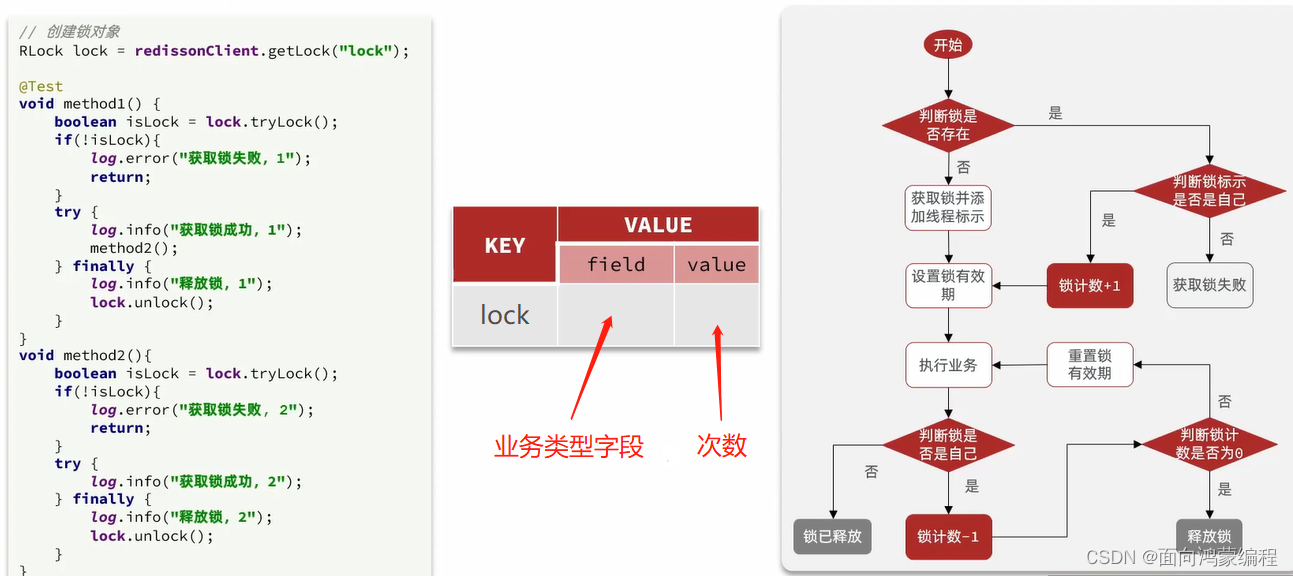 获取锁的时候,先判断是不是同一个对象,是就将 value+1,释放锁的时候就 value-1,当其小于0时就将该key删除!