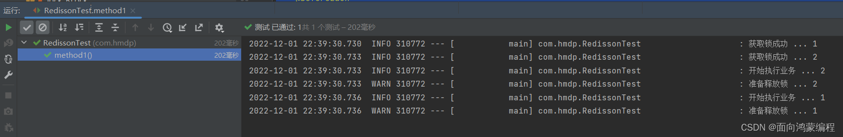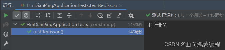 public class RedissonTest {@Resourceprivate RedissonClient redissonClient;private RLock lock;@BeforeEachvoid setUp() {lock = redissonClient.getLock("order");}@Testvoid method1() {boolean isLock = lock.tryLock();if (!isLock) {log.error("获取锁失败 ... 1");return;}try {log.info("获取锁成功 ... 1");method2();log.info("开始执行业务 ... 1");} finally {log.warn("准备释放锁 ... 1");lock.unlock();}}@Testvoid method2() {boolean isLock = lock.tryLock();if (!isLock) {log.error("获取锁失败 ... 2");return;}try {log.info("获取锁成功 ... 2");log.info("开始执行业务 ... 2");} finally {log.warn("准备释放锁 ... 2");lock.unlock();}}