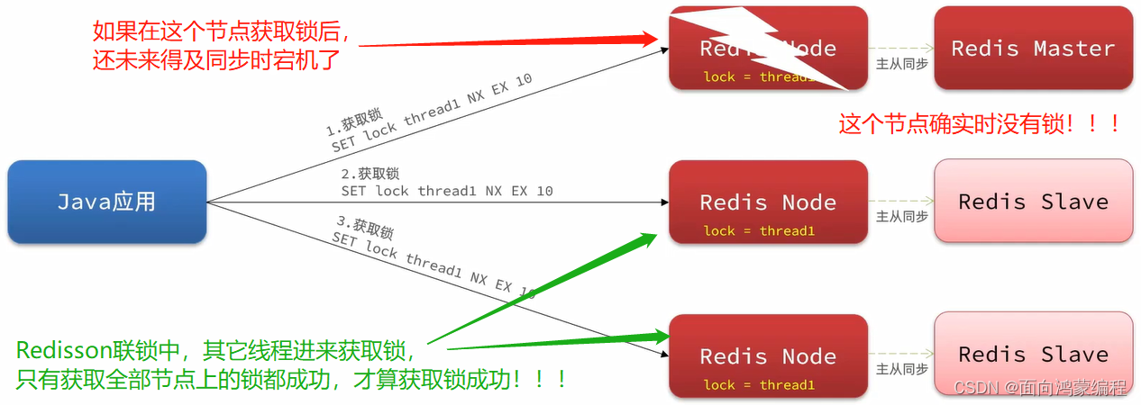 假如,在主节点中获取到了锁,在主节点向从节点同步这个锁信息的时候,主节点宕机了!那么从节点就会从中挑选一个作为主节点!