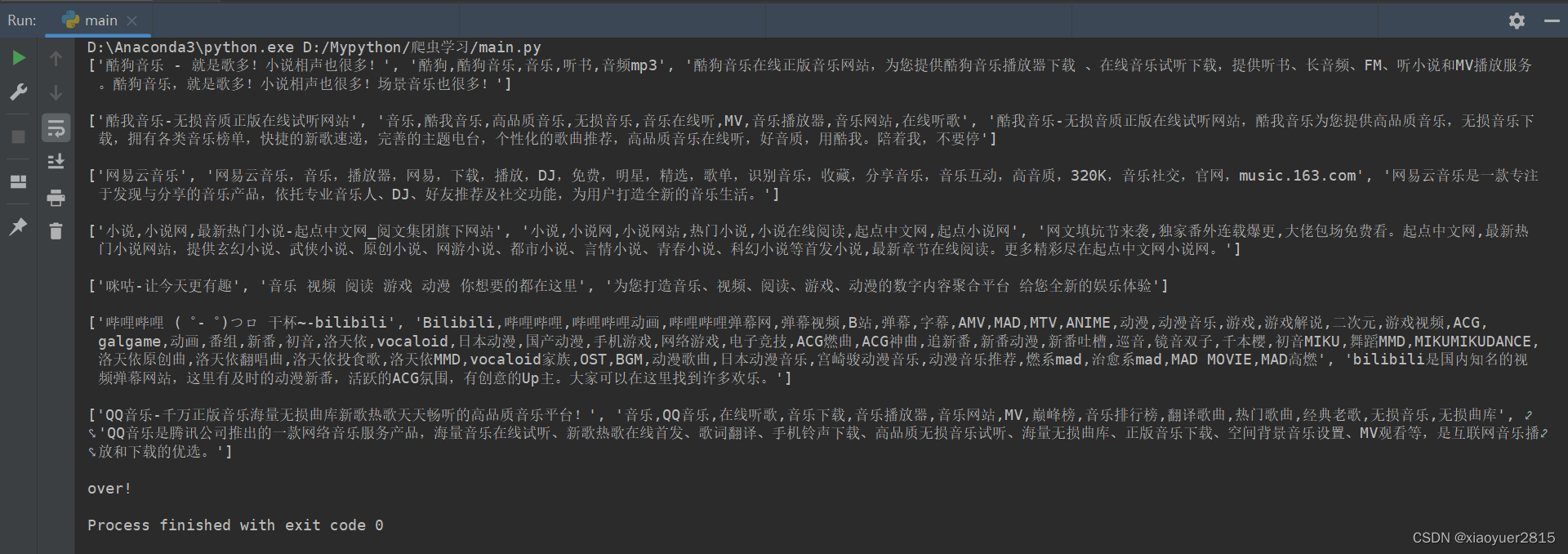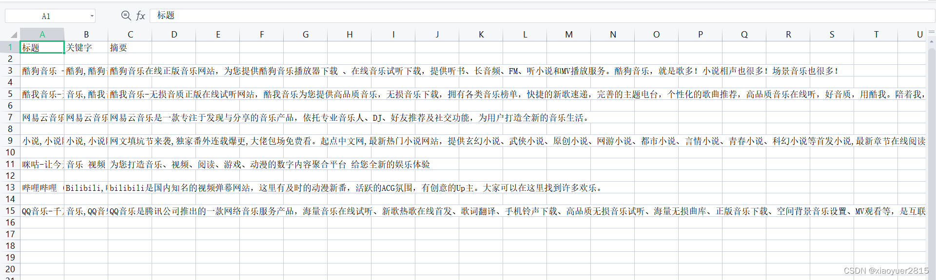在这一篇博客中,我会用python来实现一个简单的网络爬虫。简单的爬取一下一些音乐网站、小说网站的标题、关键字还有摘要!所以这个爬虫并不是万能爬,只针对符合特定规则的网站使用。(只使用于爬标题、关键字和摘要的,所以只能爬在head标签中这三个信息都有的且meta标签中name参数在本文信息前面的网站。)希望大家看了这篇博客,能对大家学习爬虫有些帮助!(并不是很高深的爬虫,很基础!!!)