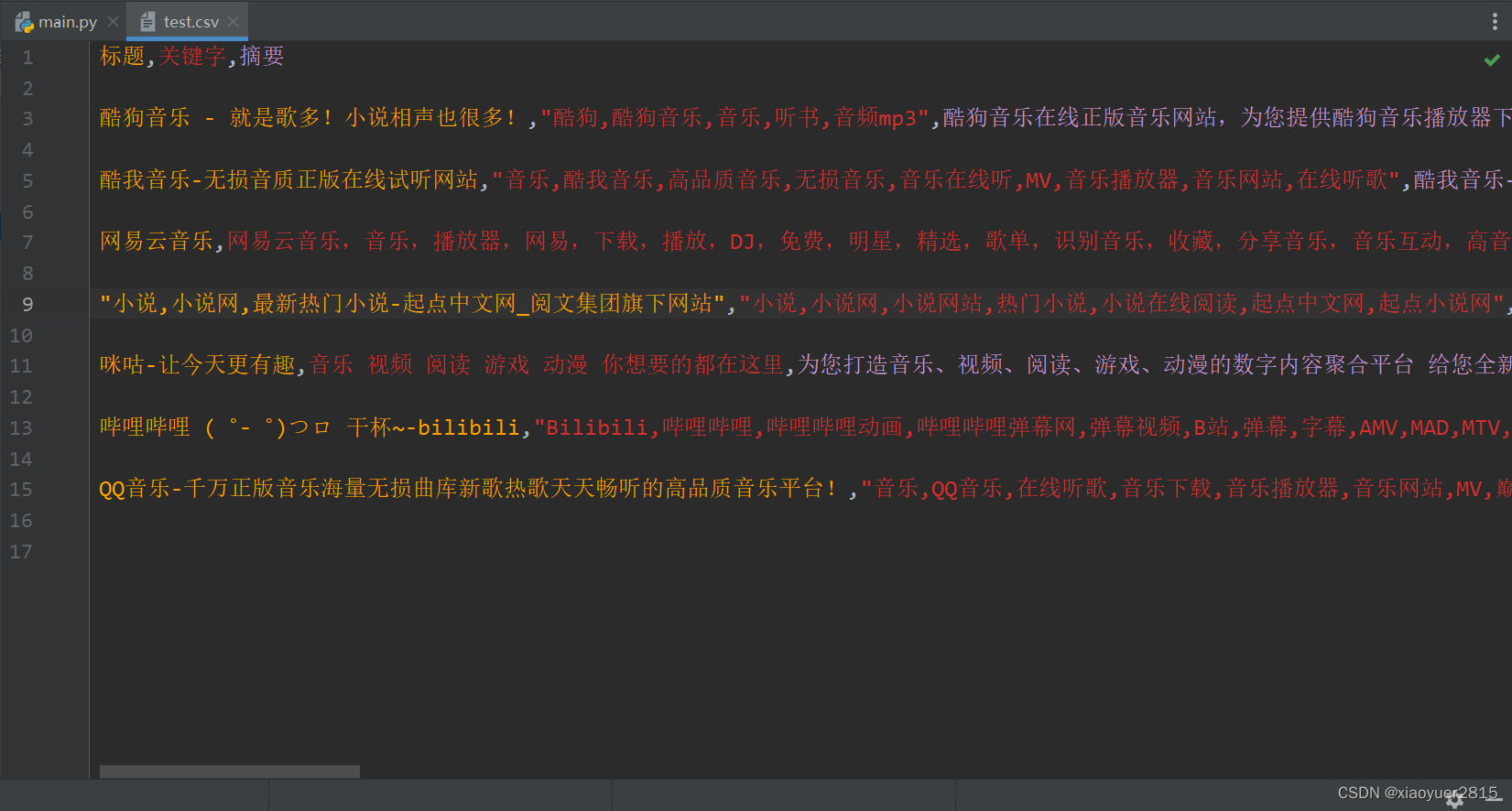 import csvurls = []# 分别是酷狗音乐、酷我音乐、网易云音乐、起点中文网、咪咕音乐、bilibili、qq音乐