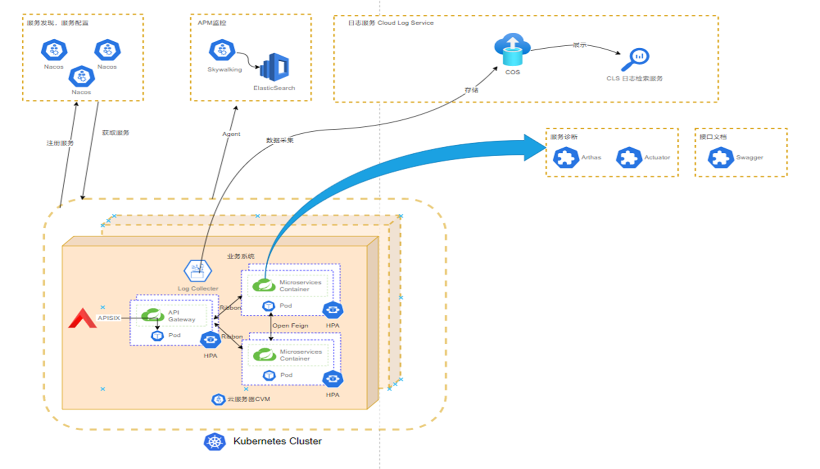 右侧是君润自研服务平台,DevOps 流程依托 Git webhook、coding、Kubernetes 集群实现全自动化与无感发布,业务系统基于 PaaS 平台进行迭代开发,确保研发规范,并达成技术栈的统一。上侧是监控手段,系统集成了 sky-agent 和 arthas,满足了线上服务观测多维度的需求。与此同时,采用腾讯日志云与 Kubernetes 结合的方式将服务日志存储在云上,实现 Kubernetes 集群内无文件化服务,避免磁盘容量堆积从而影响到 Kubernetes 集群单个节点的健康。