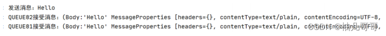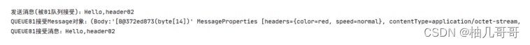 public class MQReceiver {@RabbitListener(queues = "queue_header01")public void receive01(Message message) {log.info("QUEUE01接受Message对象:" + message);log.info("QUEUE01接受消息:" + new String(message.getBody()));}@RabbitListener(queues = "queue_header02")public void receive02(Message message) {log.info("QUEUE02接受Message对象:" + message);log.info("QUEUE02接受消息:" + new String(message.getBody()));}