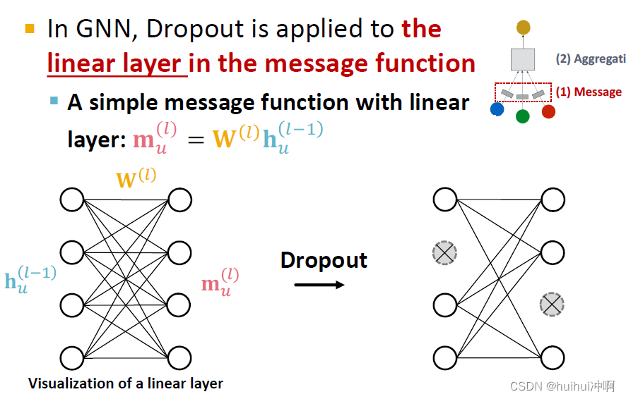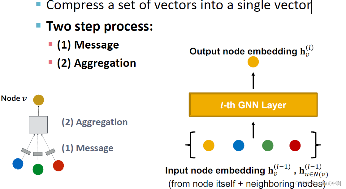 包含两部分: Message(节点嵌入的转换)与Aggregation(聚合来自不同节点的message)