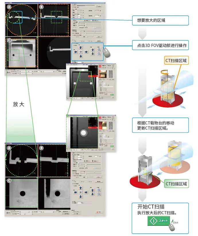 可根据CT扫描的结果对目标区域放大,再次进行CT扫描。