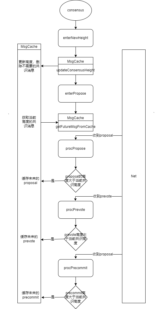 在长安链在V.2.3.0版本中,TBFT共识增加了一个MsgCache,用来缓存未来的共识消息,目前TBFT是缓存未来10个高度的TBFT消息。当TBFT节点收到来自某个节点的共识消息,判断共识消息的高度是否大于当前共识状态的高度,如果是未来10个高度以内的共识消息,则会放入到MsgCache中。当TBFT共识进入到新的高度的时候,会从MsgCache内获取当前共识高度缓存的proposal和投票(包括prevote投票、precommit投票),然后将提案和投票放入到TBFT共识的消息管道内,以便TBFT共识能够快速获取到当前共识状态所需要的消息。同时在每个新的高度,TBFT会更新MsgCache内的共识高度,每10个高度,会清理一次MsgCache内比当前共识高度低的不再需要的共识消息。