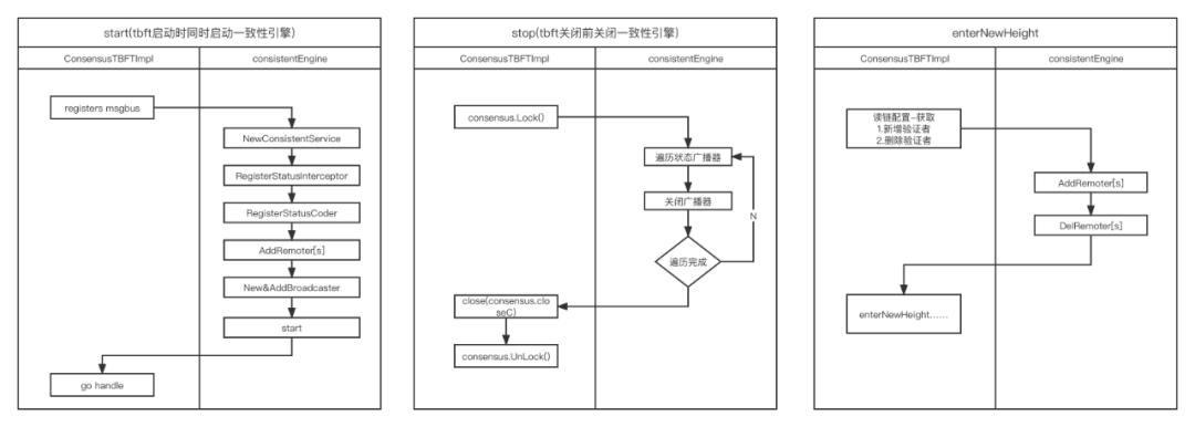 如上图所示,一致性引擎的启动随TBFT一起启动,启动时会初始化并完成注册,初始化远端节点信息,开启广播。关闭时,在TBFT关闭前,先关闭全部广播器,然后关闭TBFT共识服务。运行过程中,共识进入新的高度,读取链配置,如果有验证者变更,则触发一致性引擎远端信息的更新。