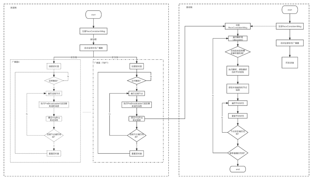 发送端:运行后会为每个广播器创建定时器(当前仅使用TBFT状态广播器),当定时器到达定时时间(默认500ms),遍历所有远端节点共识状态,通过PreBroadcaster接口返回待发送消息,通过msgBus将待发送消息发送给接收方。全部消息发送后,重置定时器,等待下一轮消息同步。