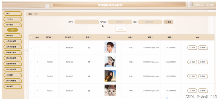 用户管理,在用户管理页面可以查看用户名、用户姓名、性别、头像、年龄、邮箱、手机等信息,并可根据需要对用户管理进行修改或删除等操作,如图5-3所示。