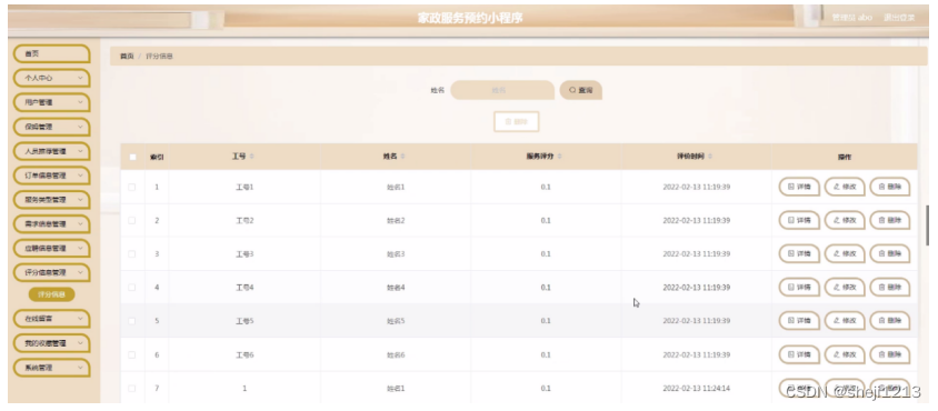 评分信息管理,在评分信息管理页面可以查看工号、姓名、服务评分、评价时间等信息,并可根据需要对评分信息管理进行详情,修改或删除等操作,如图5-9所示。