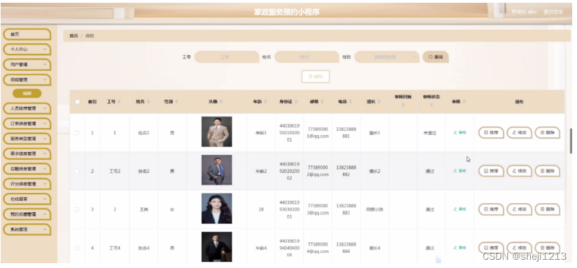 保姆管理,在保姆管理页面可以查看工号、姓名、性别、头像、年龄、身份证、邮箱、电话、擅长、审核回复、审核状态、审核等信息,并可根据需要对保姆管理进行修改或删除等操作,如图5-4所示。