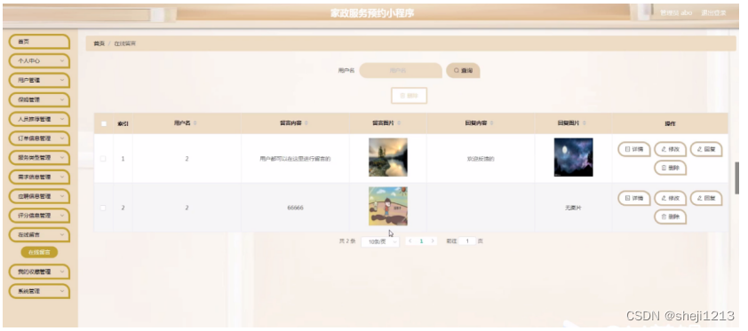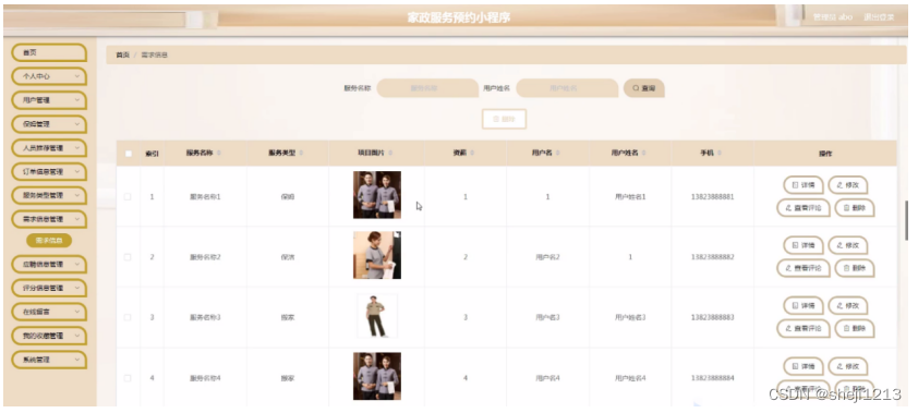 (3)对家政服务预约信息能够进行查询、修改、删除、添加等操作。